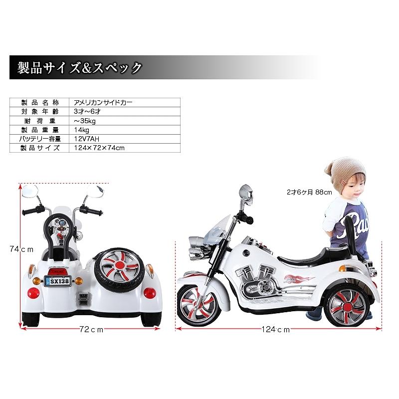 商品情報 サイズ:約124cmx72cmx74cm 乗車対象年齢:運転:3〜6歳 / サイドカー搭乗:1歳〜 モーター:35W×2 車両重量:約14kg バッテリー:12V7Ah 充電器:電気用品安全法(PSEマーク)認定品 当製品にはブレーキ装置はついておりません。 【製品保証について】 製品保証期間は商品到着より1ヵ月 ・原則として、部品提供および預かり修理対応 ・修理対応の場合、弊社まで発送するダンボール箱が必要です。 【保証対象外】 タイヤ等の消耗品、ミラー,シール等飾り部品、入荷,運搬にあたり多少の傷,へこみ,錆は保証対象外です。 ※商品が到着したら7日以内に問題がないかご確認ください。 ※不具合があった場合、不良箇所の画像の送付をお願いする場合があります。 ※輸入品のため擦りキズ等及びプラスチック成型上のへこみは保証対象外です。 乗用玩具は男の子も女の子にも贈れるプレゼントとして1歳後半から,2歳,3歳,4歳と長く使って頂けます。お誕生日、子供の日、ひな祭り、端午の節句、こどもの日、入園、卒園、入学、ゴールデンウイーク、お盆、お正月など家族が一堂に集まる際にご購入されることもございます。 |