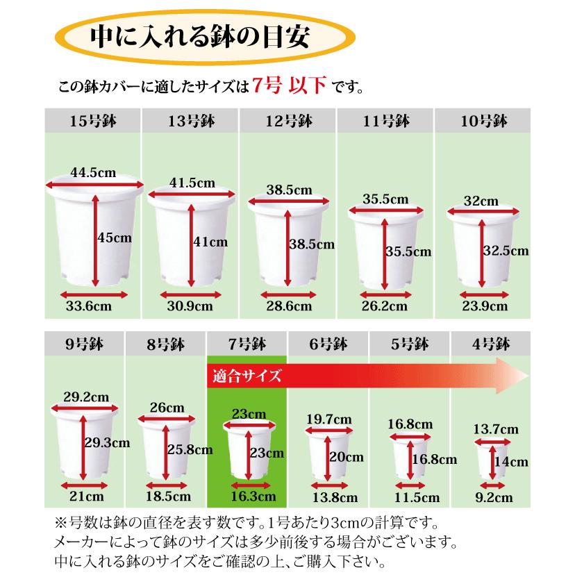 商品情報 鉢カバー(プランター/ポット/インテリア) 4種類の色の中から1つの色をお選びください。 (ツル・グレー、ツル・ホワイト、ザラ・グレー、ザラ・ホワイト) 外寸:直径30cm×高さ60cm(底径:直径17cm) 内寸:直径25cm×高さ56cm(底径:直径18cm) 重量:18.2kg 材質:セメント製 底穴:なし ・入れる鉢の形状によって底上げが必要です。 ・屋内でご使用ください。 ・セメント製品のため水の染み出る可能性があります。 ・商品の内側に必ず受皿を入れて下さい。 ・材質の性質上、白華現象や紫外線による変色の恐れがあります。また、床などに付着する恐れがありますのでご使用場所にはご注意ください。 ・サイズは多少前後する場合がございます。 ・画面上の色はブラウザや設定により、実物は異なる場合があります。 ・植物・樹木・植木・観葉植物用です。 |